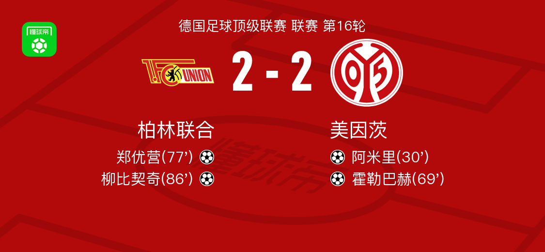 柏林聯(lián)合2-2美因茨,阿米里破僵,柳比契奇扳平比分